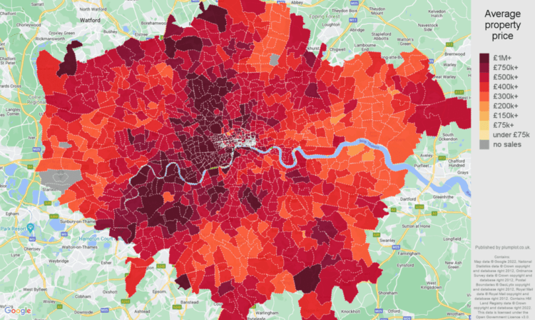 Her er et kort over London med data fra 2022, der med farver indikerer gennemsnitshuspriserne i forskellige områder:
